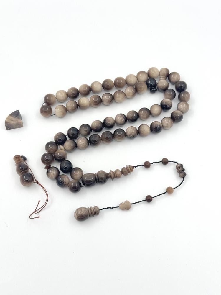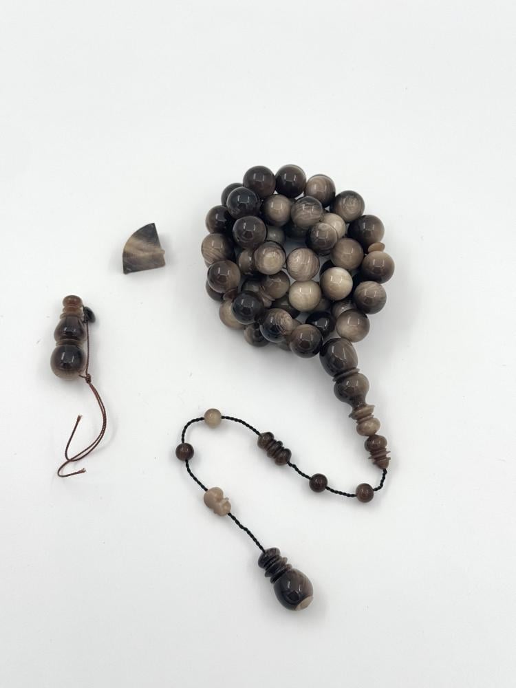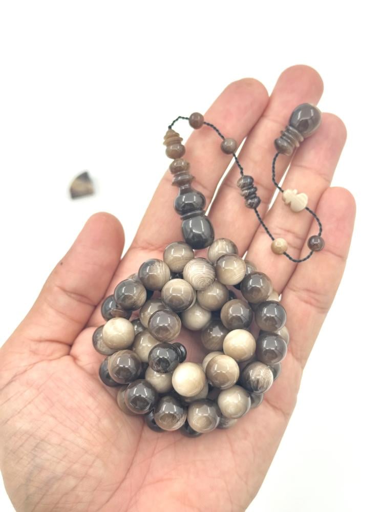 إلى هواة المسابيح المميزة والنادرة نقدم لكم هذه التحفة المصنوعة يدويا من مادة ما يعرف بالقلاليث الفرنسي. السبحة تأتي بقصة دائرية رائعة و حجم خرز مناسب للإستخدام. يأتي مع المسباح شاهد وكبوس وخرزة إحتياطية.