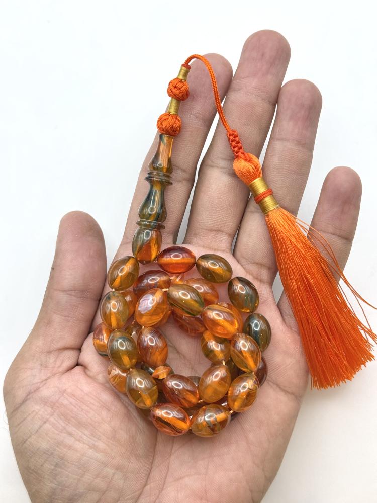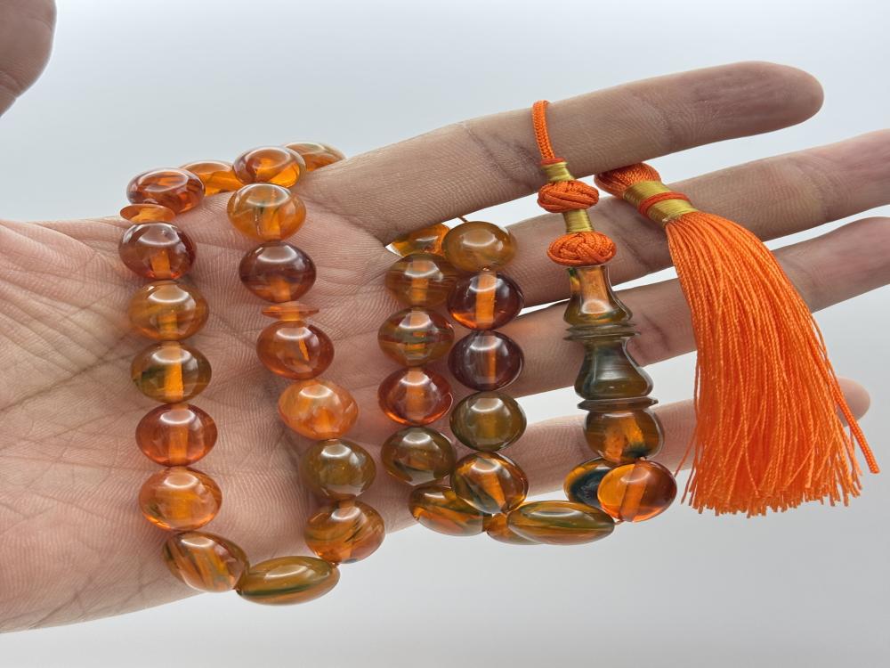 سبحة فاتوران جزري شفاف بعروق مميزة وقصة خرز بيض حمام. السبحة تأتي مع كركوشة يدوية تفصال.
